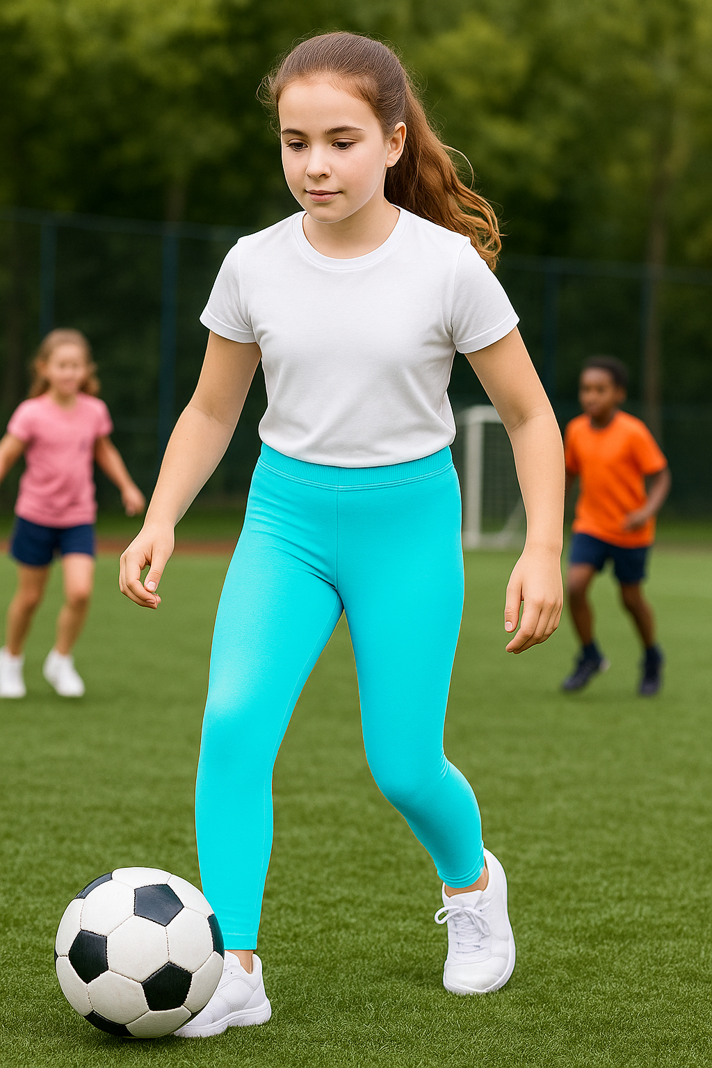 Let your girl move with comfort and style in these Aqua Blue Activewear Leggings from Pop Couture. Crafted from smooth polyester lycra fabric, they offer stretch, breathability, and wrinkle-free performance  perfect for school, sports, or play.